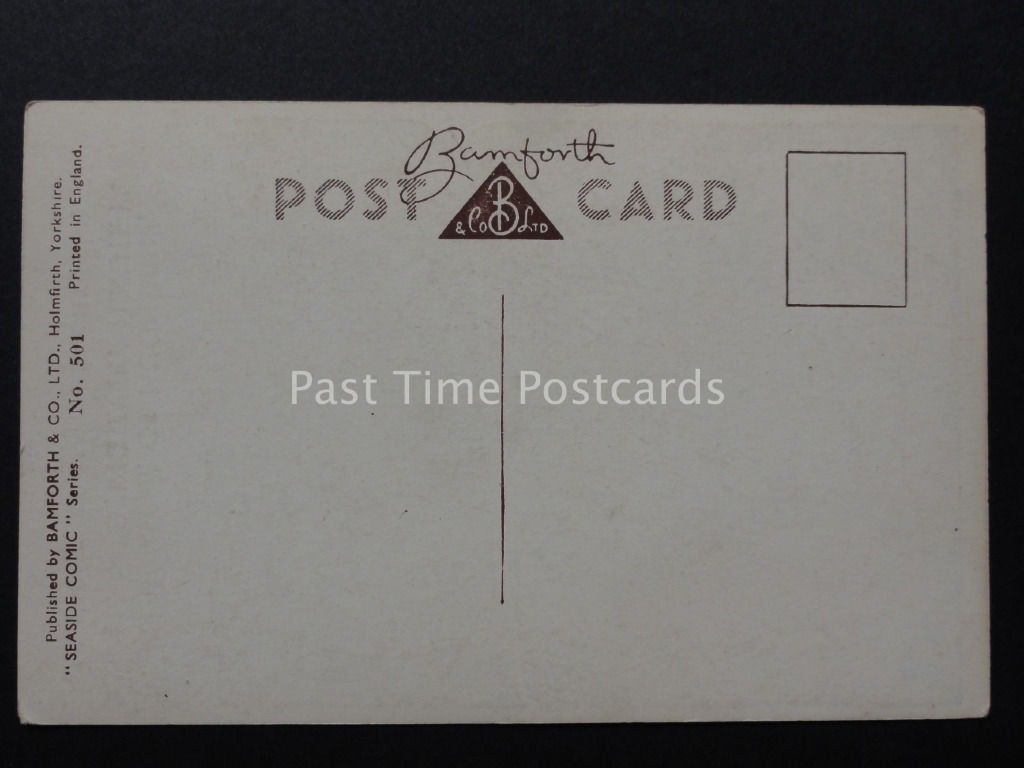 Description Click to Enlarge Click to Enlarge Postcard Details: Publisher - Bamforth & Co, SEASIDE Series Postcard Number - No. 501 Postcard Condition - (VG) Very Good Postally used - Additional Information - Postal Details - Please see detail on the photographic image or contact us for details. Abbreviations: (UB) Undivided Back / (RP) Real Photo Postcards (PM) Postmark Interest / (CDS) Circular Datestamp / (SQ.C) Squared Circle / (DUP) Duplex Postmark Combined Postage Please read the 'Combined Postage Discounts for Multiple Purchases' section on the front page of our Hip store for full details on how to purchase items using your 'BASKET' Welcome Welcome to our postcard and social history emporium. At Past Time Postcards we stock a comprehensive range of British antique and vintage topographical postcards. We aim to make your shopping experience enjoyable and stress free. We list our postcards topographically and by subject matter to make it easier for you to locate the items that interest you. Feel free to brouse and explore at your leisure, however if you can't find what you are looking for or need any support please don't hesitate to contact us. Postage & Packaging Postage rates are calculated to include postage and packaging. All single postcards are posted with protected with plastic sleeve in a board backed envelope for added security and protection. Small parcels are securely posted in protected jiffy style padded envelopes. Payment Methods Our preferred method of payment is through Paypal for all purchases. UK CUSTOMERS: can make payment by Paypal, Personal Cheque or Postal Order. PLEASE NOTE: Credit cards included in PayPal payment method inc Visa, MasterCard, American Express, Discover. FOR CUSTOMERS OUTSIDE THE UK: we can only accept Paypal as method of payment. PLEASE NOTE: Credit cards included in PayPal payment method inc Visa, MasterCard, American Express, Discover. All successful purchases should be paid for within 5 days, unless you are waiting for other items to finish to combine the postage, a courteous e-mail to that effect will suffice. Items will be dispatched upon receipt of cleared funds. NOTE: Please contact us if you have any questions, We are always pleased to help and answer any questions you may have. Kind regards - Past Time Postcards 100% Satisfaction If in the unlikely event you are unhappy with your item you have purchased on the basis that the postcard was incorrectly described or graded we do offer a complete refund less the cost of postage and packaging once the item is returned to us. Postcard Condition & Grading Information (M) Mint : Like new. Almost perfect. (EX) Excellent : No obvious flaws. Sharp corners, clean and if postally used, writing does not detract from appearance. (VG) Very Good : Minor defects such as album marks, signs of age and handling acceptable that do not detract from a visually pleasing card. (G) Good : Noticeable defects, handling and wear apparent. Slight creasing and minor postal damage not detrimental to image acceptable in this category. (F) Fair : Obvious creasing, staining, small tears or damp damage evident. Significant edge or corner damage. Just about in a collectable state. (P) Poor : Incomplete, image seriously affected. Payment Details............ UK buyers: Payment accepted by Paypal, Cheque and Postal Orders. Non-UK buyers: Payments accepted by Paypal method only. PLEASE NOTE: Credit cards included in PayPal payment method inc Visa, MasterCard, American Express, Discover. Making a Payment............. Payment appreciated within 5 days unless you are waiting for other items to finish. Please email me to let me know if this is a problem. I am always willing to help or answer any question you may have. Kind regards - Past Time Postcards Shipping Terms........... Multiple purchases: Postage costs will be combined - please wait for the invoice to arrive before sending payments. Just one of inkFrog's Creations inkfrog terapeak i000000 inkFrog Analytics