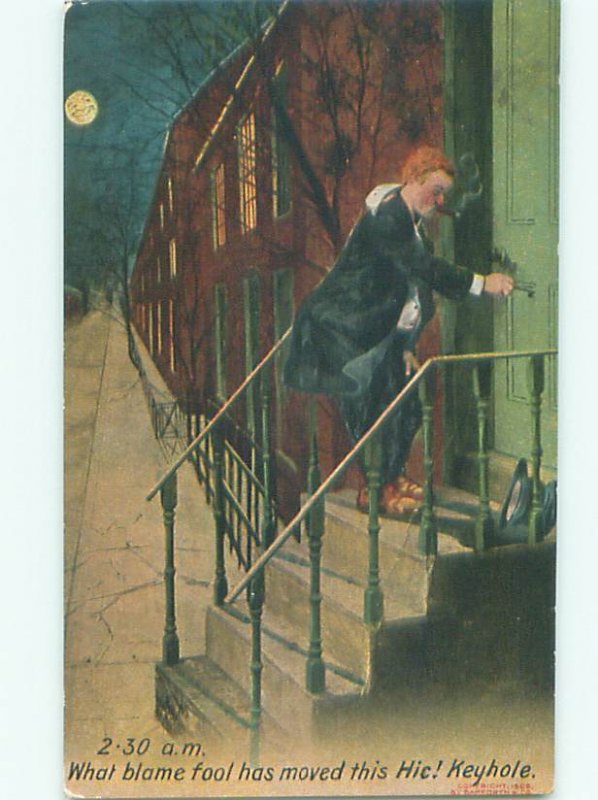 Bamforth Comic DRUNK MAN TRYING TO FIND THE KEYHOLE AB9923