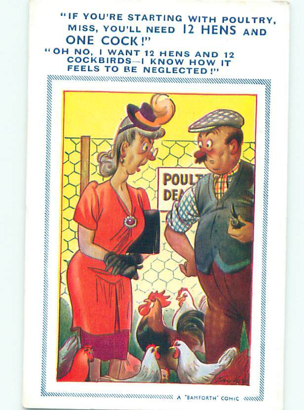 Bamforth Comic WOMAN MAKING ROOSTER JOKE AB9833