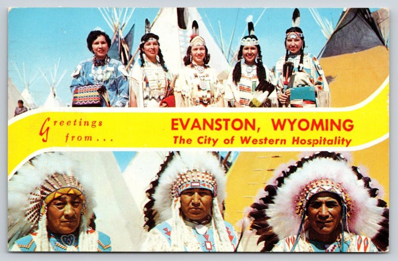 Banner~Greetings From Evanston Wyoming~Native Maidens~Tepee~Chiefs~1961 Postcard