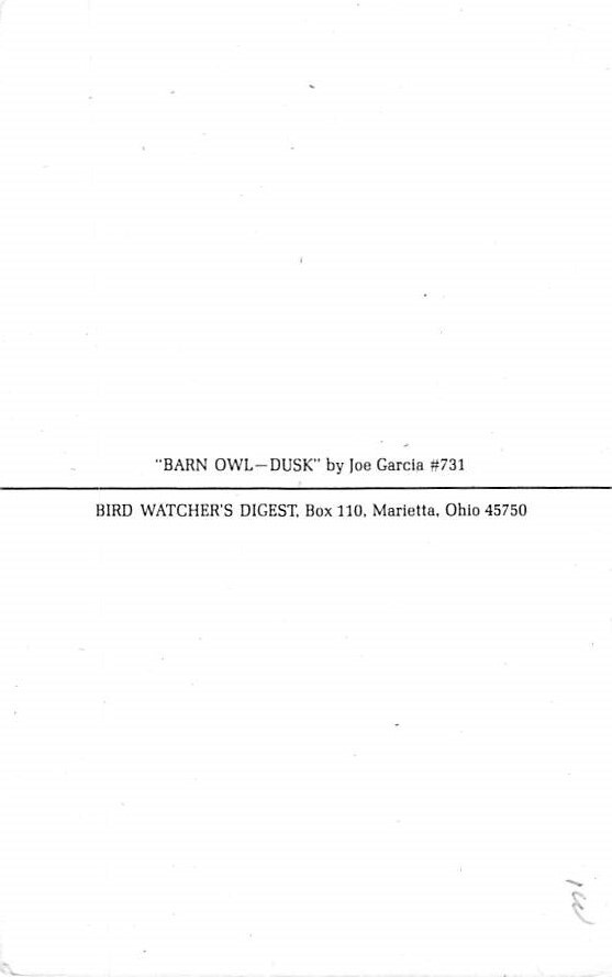 Barn Owl, Dusk, By Joe Garcia Postcard Unused, Grade: 2, , Size: Continental size: Approx 4 x 6 inch (15 cm X 10.5 cm) Grading Scale: Grade 1 = Perfect corners Grade 2 = Very Minimal corner wear, no creases Gr ... Read More