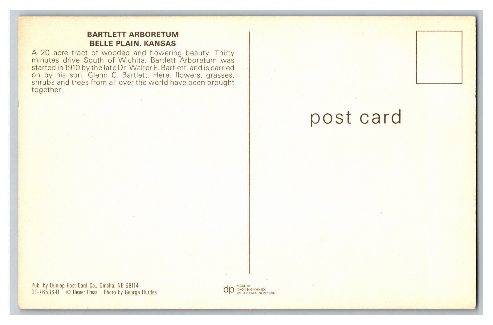 Condition: Unmailed, Showing Wear From Handling. Reasonable Offers Always Considered. Bartlett Arboretum Belle Plain, Kansas Postcard #1 Vintage Standard View Postcard Postcard Enclosed in Clear Sleeve Placed ... Read More