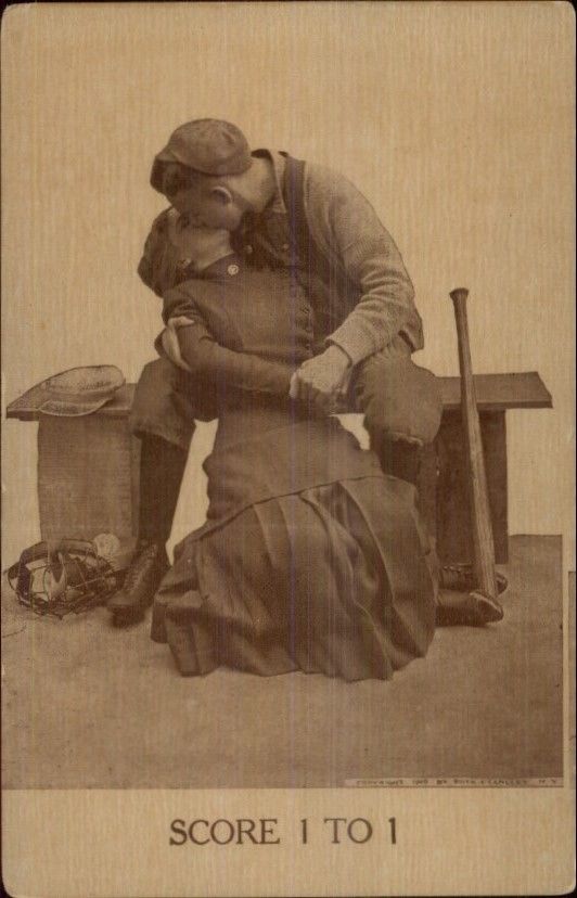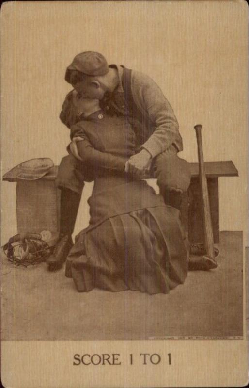 Baseball Romance - Score 1 to 1 - Couple Kissing c1910 Postcard