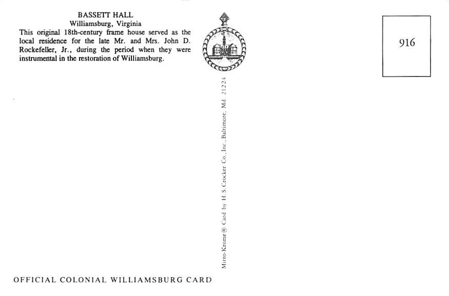 Bassett Hall - Williamsburg, Virginia Grade: 1 Category: Continental Size Postcard, Approx 4 in x 6 in (10 cm x 15.25 cm) Product Size: Continental size: 4X6 inches (10.5 cm x 15 cm) Grading Scale: Grade 1 = P ... Read More