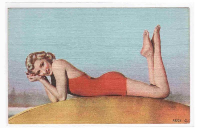 Description: Bathing Beauty Pin Up AB503 linen postcard