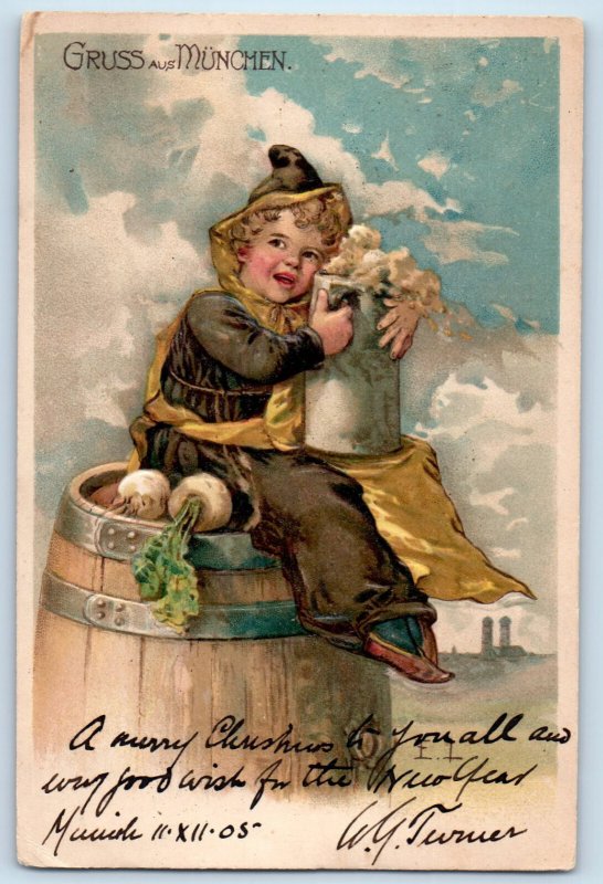 Bavaria Germany Postcard Greetings from Munich Barrel Boy Vegetable 1905