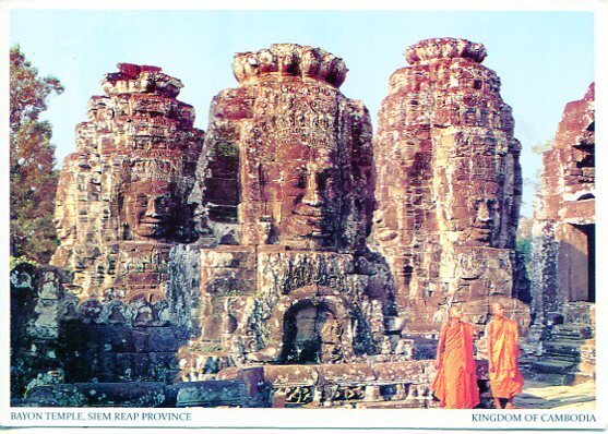 Stone towers with serene faces of Avalokiteshvara as saffron-robed monks pass through. Modern Picture Postcard Continental Size or Slightly Larger.Seller Information