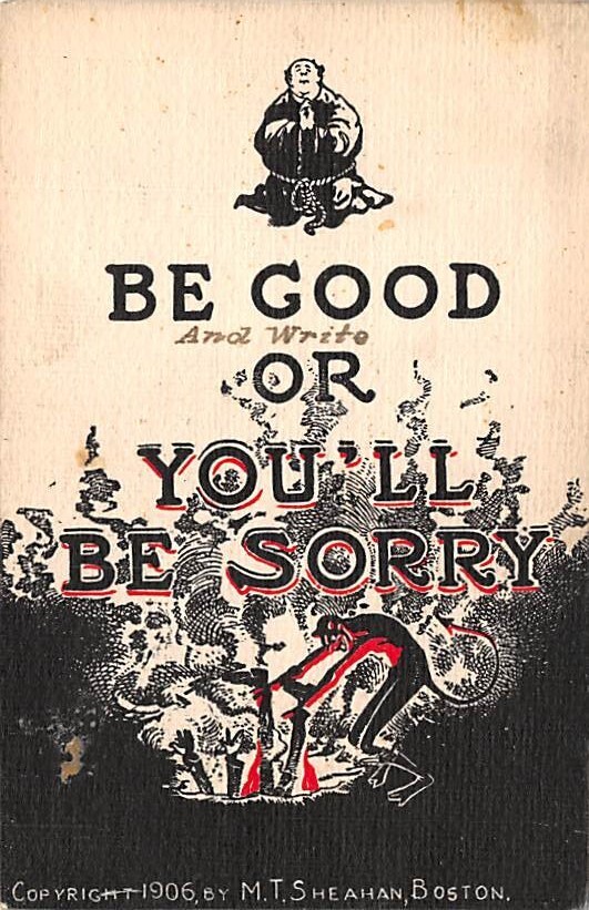 Be good or you'll be sorry Oddities Postcard PU Unknown, Grade: 3, , Size: Regular size: Approx 3 1/2 X 5 1/2 inch (9 cm X 14 cm) Grading Scale: Grade 1 = Perfect corners Grade 2 = Very Minimal corner wear, no ... Read More
