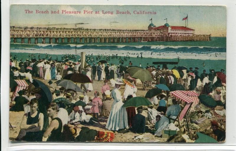 Beach Crowd Pleasure Pier Long Beach California 1920 postcard