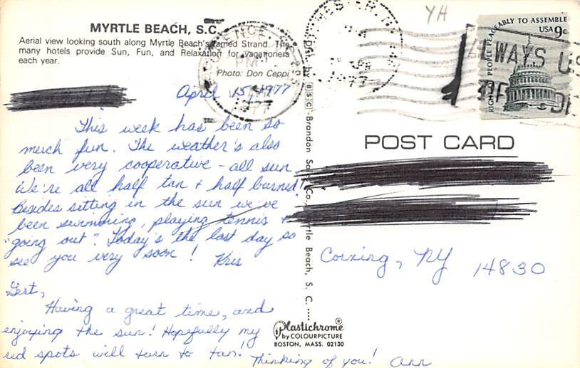 Beach Scene Myrtle Beach, South Carolina Postcard - Postal used unknown Grade: 1 Size: R - Regular size: Approx 3 1/2 X 5 1/2 inch (9 cm X 14 cm) Grading Scale: Grade 1 = Perfect corners Grade 2 = Very Minimal ... Read More