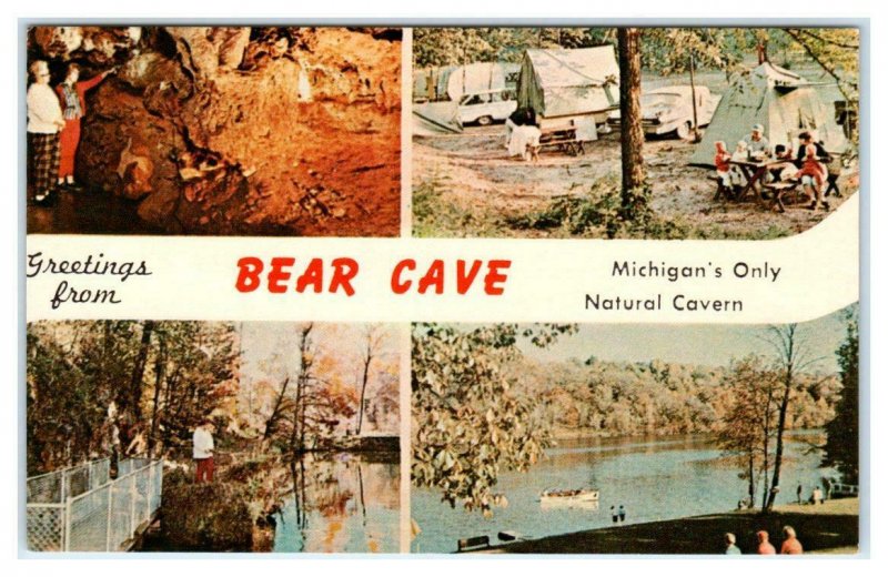BEAR CAVE, MI ~ Michigan's Only Natural Cavern CAMPERS, TENTS c1960s Postcard