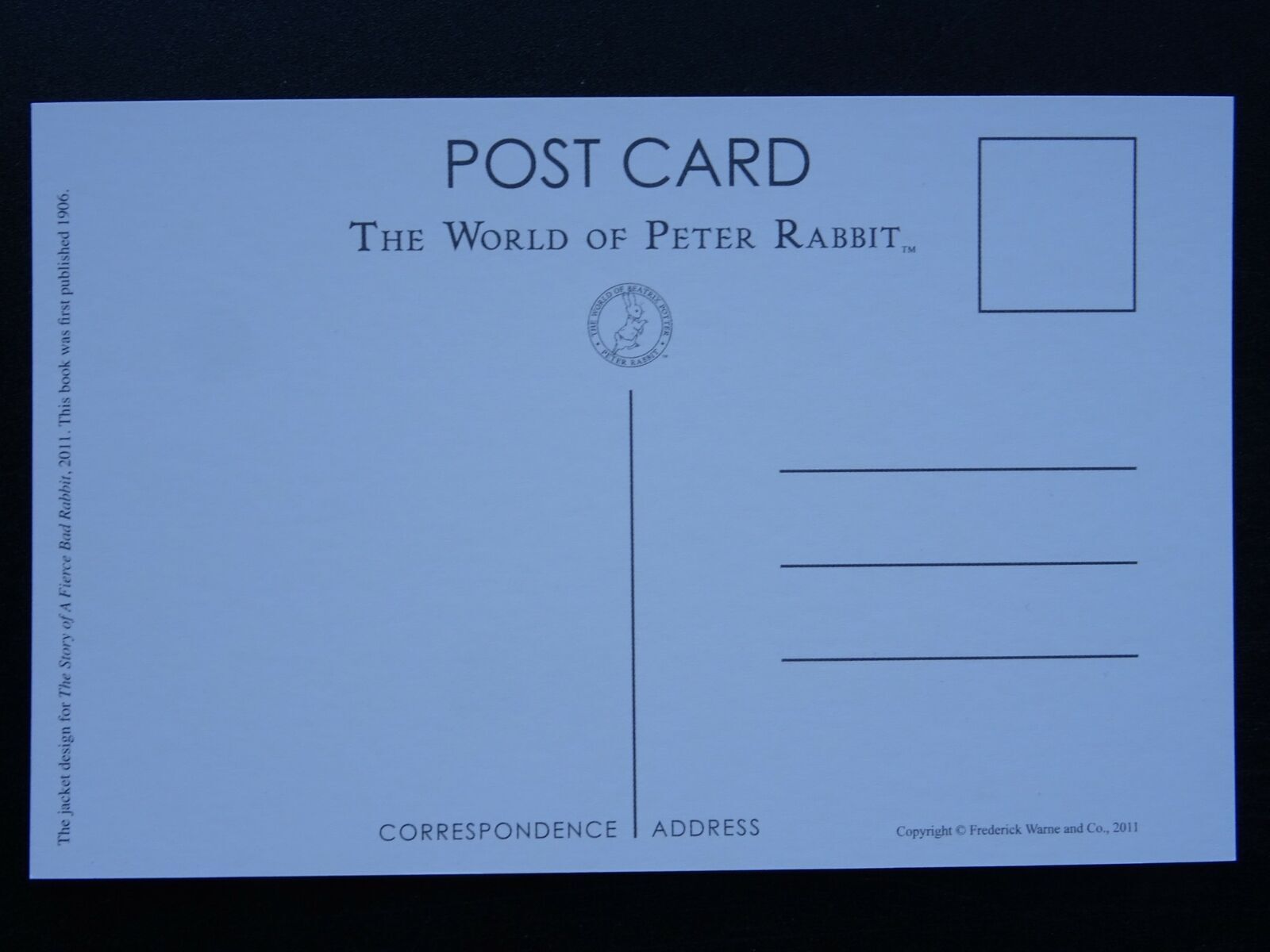 Beatrix Potter Character A FIERCE BAD RABBIT jacket design Postcard Beatrix Potter Character A FIERCE BAD RABBIT jacket design Postcard Postcard Details Additional Information - Published in 2011 from originalPostcard Condition (VG) - Very Good / Postally - unused / Postcard Details - Please see detail on the photographic image or contact us for details. Abbreviations: (UB) Undivided Back / (RP) Real Photograph Postcard / (PM) Postmark Interest / (CDS) Cancellation Date Stamp / (SQC) Squared Circle / (DP) Duplex PostmarkPTP Reference - 011121 Postcards WelcomeWelcome to our store. At Past Time Postcards we stock a comprehensive range of British antique and vintage topographical postcards, cigarette cards, rare antique prints and other antique collectables.We aim to make your shopping experience enjoyable and stress free. We list our postcards topographically and by subject matter to make it easier for you to locate the items that interest you. Feel free to browse and explore at your leisure, however if you require assistance locating items or have a specific request please don't hesitate to contact us.Combined Postage We will always combine postage when you purchase multiple items. Please make your multiple purchases by using your Hip BASKET where postage will be combined automatically.Postage & PackagingPostage rates are calculated to include postage and packaging. All Full Sets of Cigarette or Trade Cards are posted 1st Class and protected with a plastic sleeves in a BOARD BACKED ENVELOPE & FULL SET HAVE ADDED STIFFNER BOARD for added security and protection. Payment MethodsOur preferred method of payment is through PayPal for all purchases.UK CUSTOMERS can make payment by PayPal, Personal Cheque or Postal Order. PLEASE NOTE: Credit cards included in PayPal payment method Inc. Visa, MasterCard, American Express, Discover. FOR CUSTOMERS OUTSIDE THE UK: we can only accept PayPal as method of payment100% SatisfactionIf in the unlikely event you are unhappy with your item you have purchased on the basis that the postcard was incorrectly described or graded we do offer a complete refund less the cost of postage and packaging once the item is returned to us.Condition & Grading Information(M) Mint – Like new, almost perfect(EX) Excellent – No obvious flaws, sharp corners, clean and if postally used the writing does not detract from appearance.(VG) Very Good - Minor defects such as album marks, signs of age and handling is acceptable that do not detract from appearance.(G) Good – Noticeable defects, handling and wear apparent. Minor creasing or minor postal damage not detrimental to image.(F) Fair – Obvious creasing, staining, small tears or damp damage evident. Significant edge or corner damage.(P) Poor – Incomplete or image seriously affectedFinally if you have any specific requests or questions we are always very pleased to offer support and assist you with your collecting needs.Kind regardsMark - Past Time Postcards Listing and template services provided by inkFrog