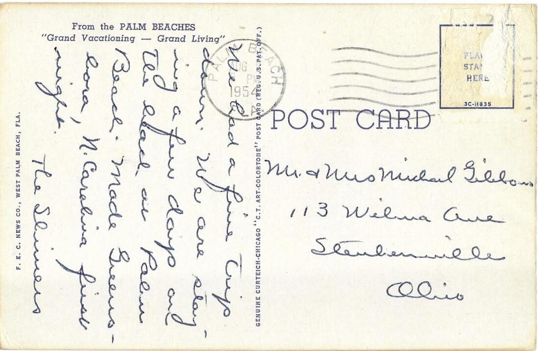 Beautiful Royal Palm Way, Palm Beach Florida. Mailed 1954 stamp no longer present