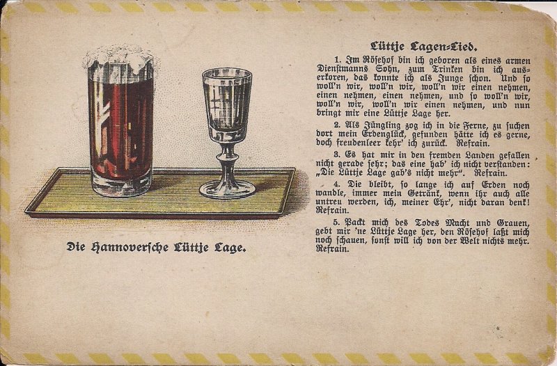Standard size divided back postcard from Hannover, Germany featuring a glass of beer and schnapps with song lyrics. Postmarked 1906. Medium good condition, torn corners, please see both scans. As is sale.Seller Information