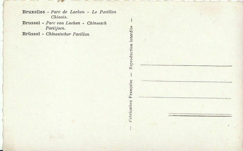 Mo's Postcards Title: Belgium Postcard - Brussel - Chinesischer Pavillon Publisher: As seen in the scanned image Postally Used: Unused Defect(s): Postage & Payment: For U.K residents the quoted P & P fee is for any ... Read More