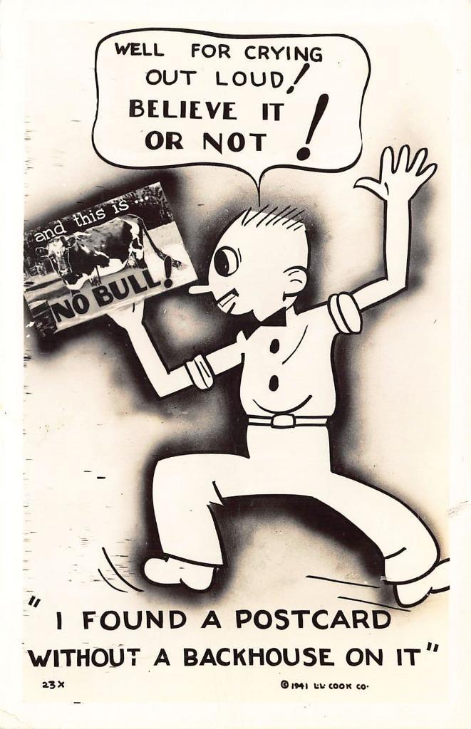 "Believe it or Not I found a Postcard Without a Backhouse On It" , real photo Postcard "Believe it or Not I found a Postcard Without a Backhouse On It", real photo Postcard?. Please see shipping and handling information. PLEASE SEE SCANS. THIS COVER, IS AN ORIGINAL AND NOT A COPY. For More Great Postcards, Tradecards, Covers, etc.? Visit our Hip Store: popcornjohn.com Postcard(s) will be shipped in a rigid mailer, includes tracking within the U. S. We also pay for insurance (from a Private Insurance Company), included on on all shipments $50.00 or over. Foreign buyers please contact us for shipping fee. Get images thatmake Supersized seem small.THE simple solution for Hip sellers.Track Page Views WithAuctiva's FREE Counterinkfrog terapeak