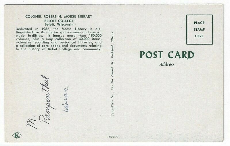 Condition: Used A 1960's era chrome postcard showing a view of Colonel Robert H. Morse Library at Beloit College in Beloit, Wisconsin. Unposted. No creases, slight corner wear. Guaranteed authentic, not a copy. ... Read More