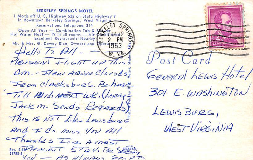 Berkeley Springs Hotel, Berkeley Springs, West Virginia WV Postcard - 1963 Grade: 2 small hole in card Size: R - Regular size: Approx 3 1/2 X 5 1/2 inch (9 cm X 14 cm) Grading Scale: Grade 1 = Perfect corners ... Read More