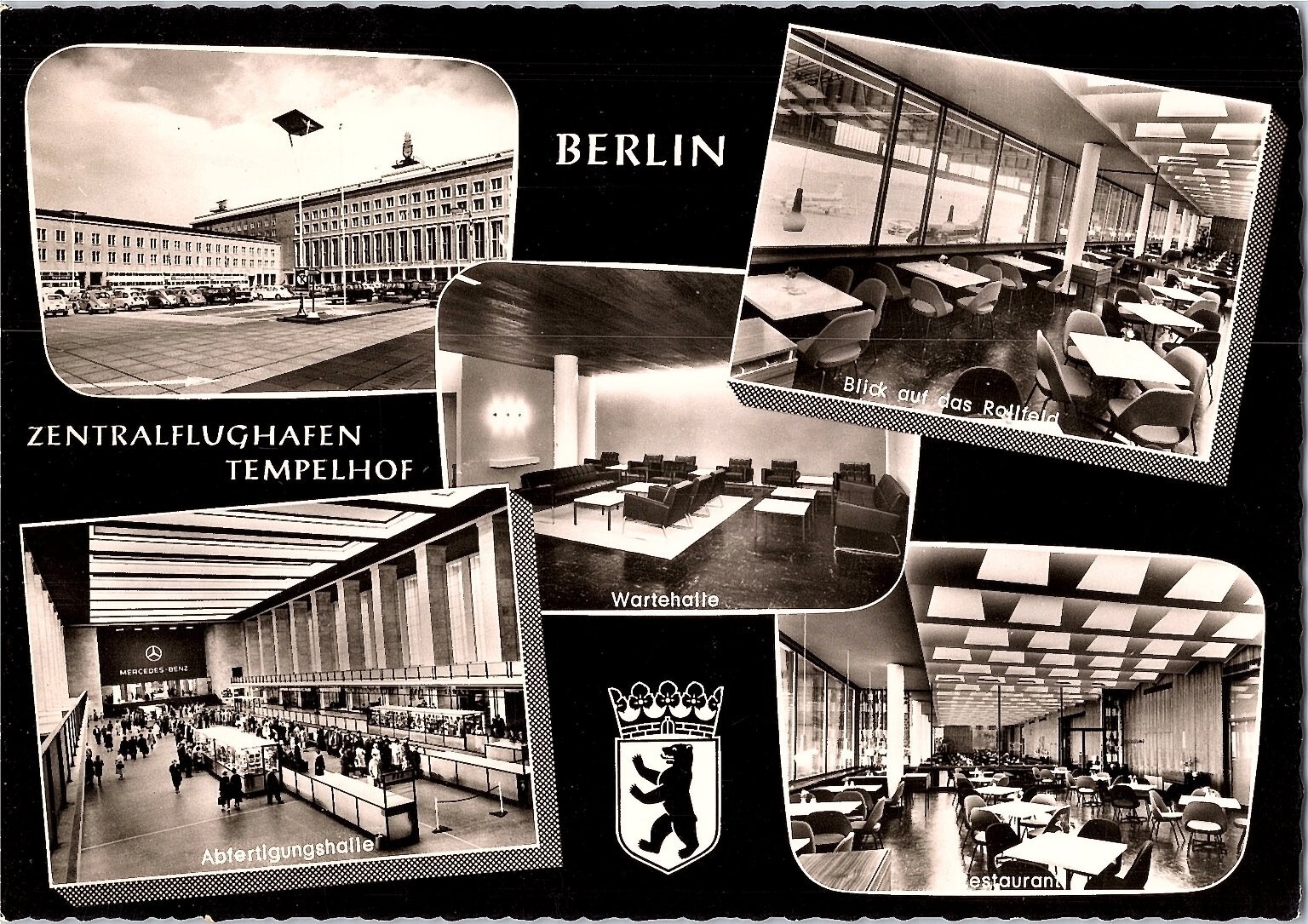 This vintage real photo postcard from the 1960s showcases multiple views of Berlin's iconic Zentralflughafen Tempelhof, a historically significant airport in Germany. The postcard features detailed black and white images including the airport's main terminal building, bustling departure hall, cozy waiting lounge, and spacious restaurant with views of the airfield. The design also includes the Berlin bear crest, emphasizing the postcard's geographical and cultural connection.Printed by Kunst und Bild, Berlin-Charlottenburg, this continental-sized (6 x 4 inch) postcard is a classic example of photochrome production from the mid-20th century. Collectors and enthusiasts will appreciate its depiction of Cold War-era aviation architecture and the modernist interior design elements of the period. A great collectible piece for those interested in German history, vintage airports, or post-war European travel memorabilia.