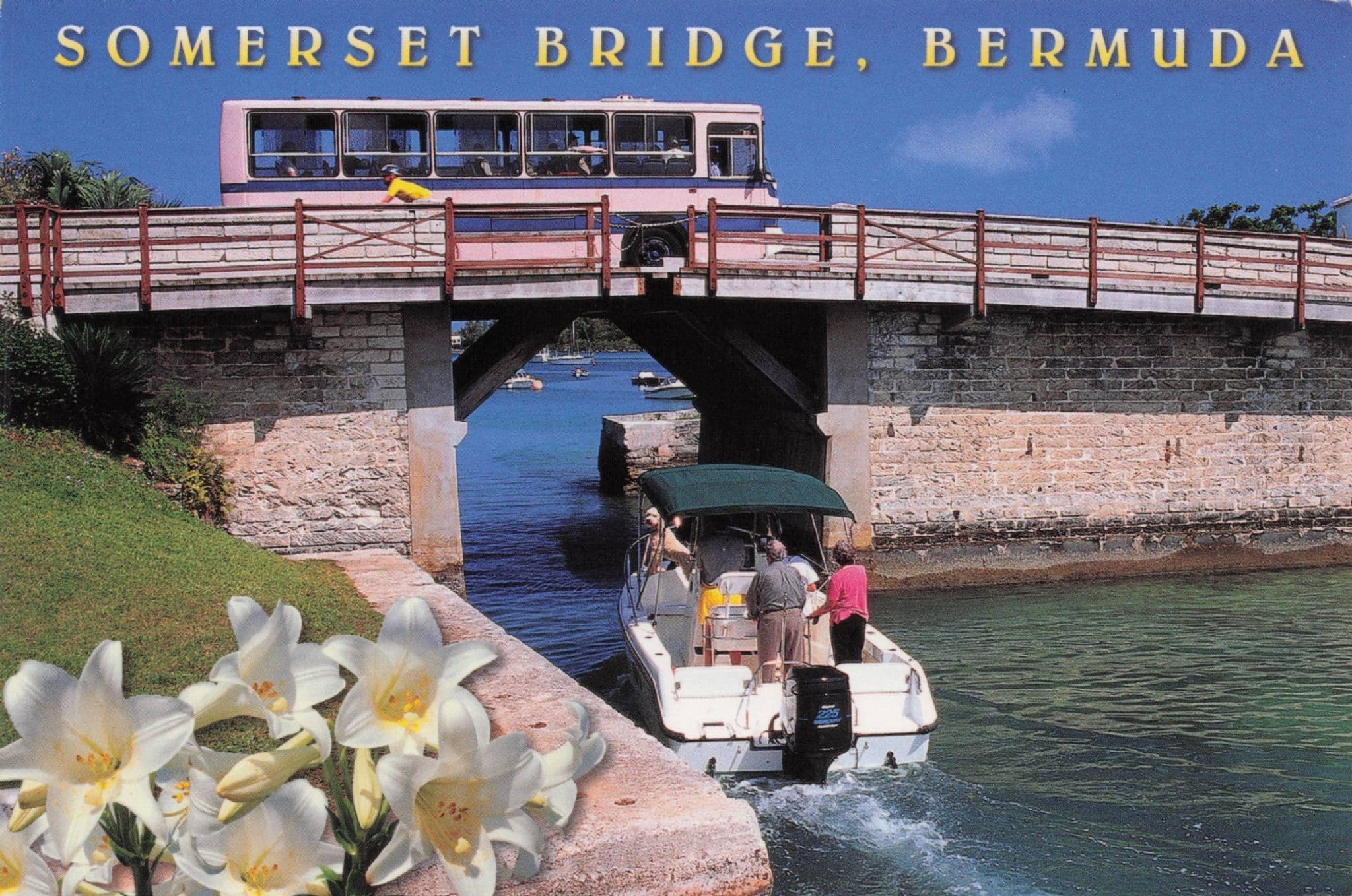 bg460x A rare postcard undated but circa 1990s origin of Bermuda and this local bus travelling over Somerset Bridge at an identical time of a boat with its passengers is underneath the bus on the bridge with specia ... Read More