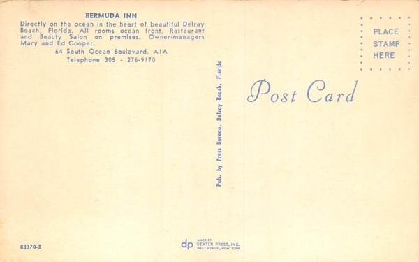 Bermuda Inn Delray Beach, Florida Postcard - Unused Grade: 1 Size: R - Regular size: Approx 3 1/2 X 5 1/2 inch (9 cm X 14 cm) Grading Scale: Grade 1 = Perfect corners Grade 2 = Very Minimal corner wear, no cre ... Read More