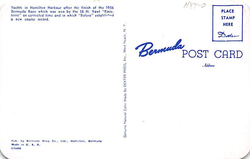 Bermuda Race, Hamilton Harbour Bermuda Postcard Postal Date: {{Product Field 4 ( Postal Used, Unused)}} Grade: 1 Size: Regular Size Postcard - approximately 3 1/2 inch x 5 1/2 inch (9 CM x 14 CM) Grading Scale ... Read More
