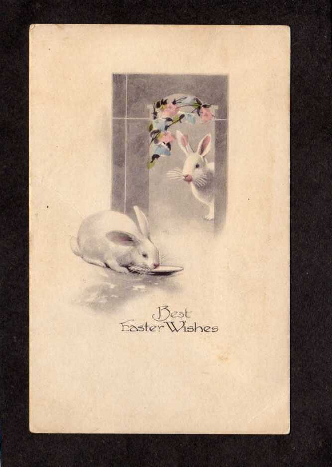 Best Easter Wishes Greetings Postcard Rabbits Bunny Flowers