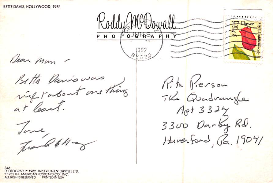 Bette Davis - Grade: 1 Category: Continental Size Postcard, Approx 4 in x 6 in (10 cm x 15.25 cm) Product Size: Continental size: 4X6 inches (10.5 cm x 15 cm) Grading Scale: Grade 1 = Perfect corners Grade 2 = ... Read More