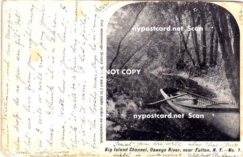 Big Island Channel, Fulton Ny Description: Postal Usage: PM 1908 Condition: Average Type: Printed Note: County: Oswego Co. > Fulton