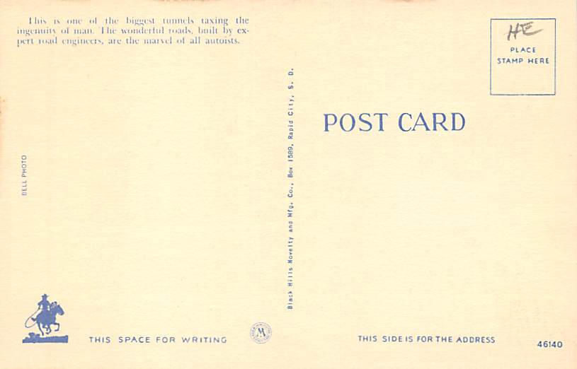 Big tunnel, needles Highway Custer State Park Postal Date: Unused Grade: 4 - paper wear right edge Size: Regular Size Postcard - approximately 3 1/2 inch x 5 1/2 inch (9 CM x 14 CM) Grading Scale: Grade 1 = P ... Read More