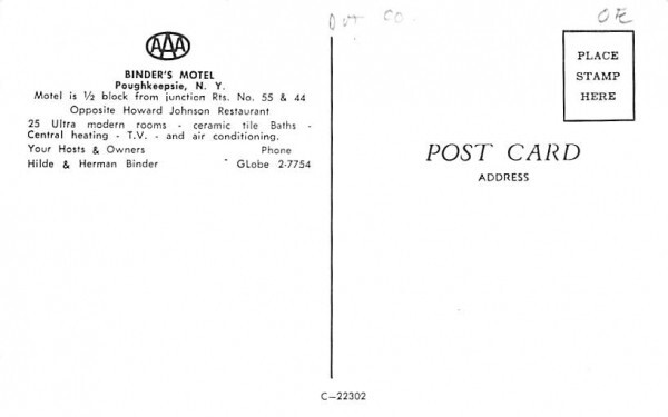Binder's Motel in Poughkeepsie, New York Postcard - Unused Grade: 1 Size: R - Regular size: Approx 3 1/2 X 5 1/2 inch (9 cm X 14 cm) Grading Scale: Grade 1 = Perfect corners Grade 2 = Very Minimal corner wear, ... Read More
