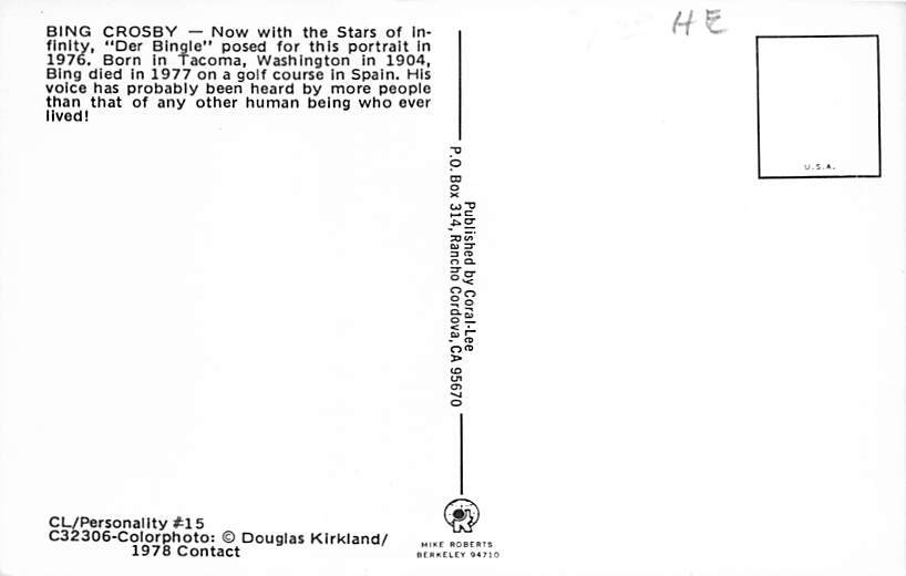 Bing Crosby Postcard View Back Image, Grade: 1, , Size: Regular Size Postcard - approximately 3 1/2 inch x 5 1/2 inch (9 CM x 14 CM) Grading Scale: Grade 1 = Perfect corners Grade 2 = Very Minimal corner wear, ... Read More