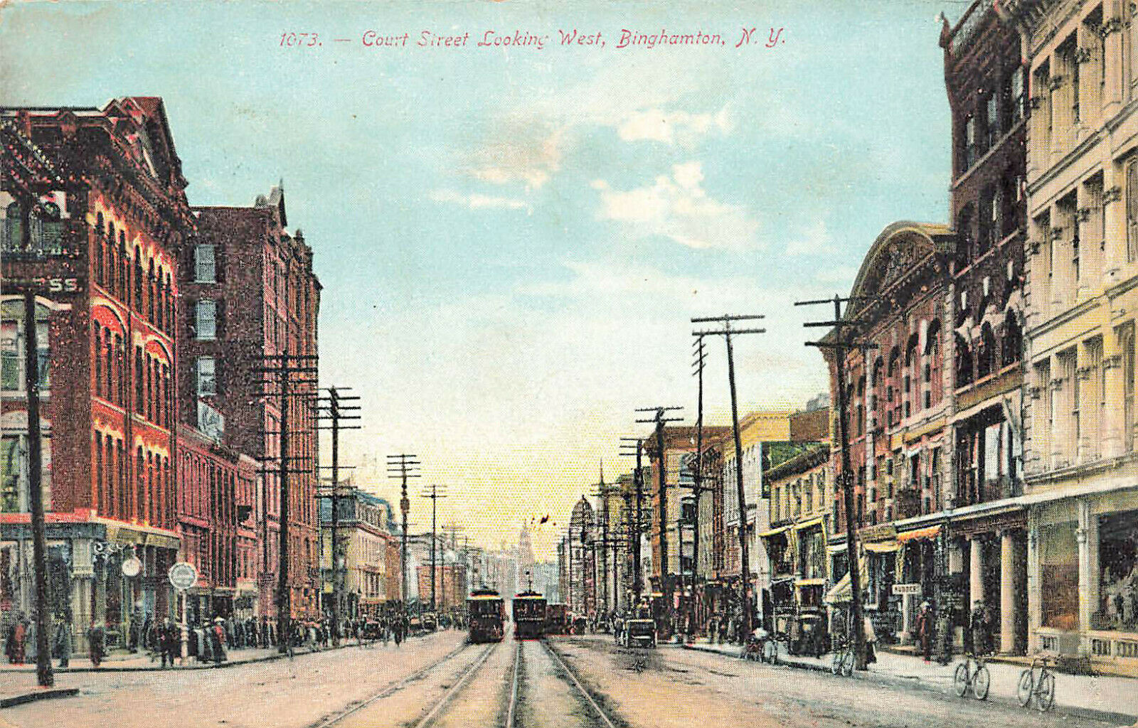 Binghamton NY Court Street Trolley's Looking West Bicycles Postcard