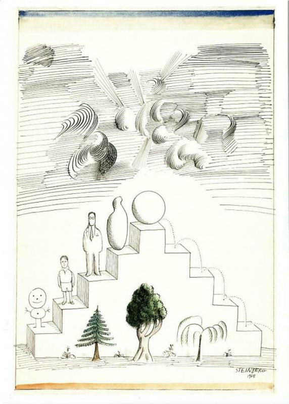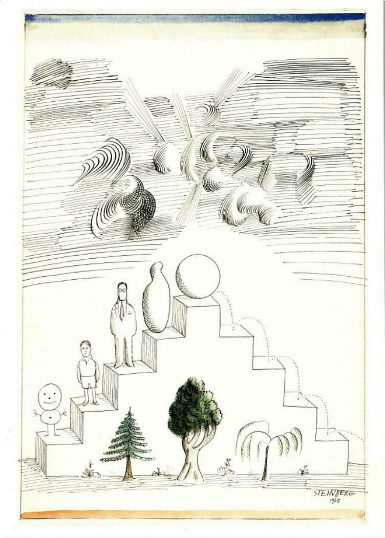 A postcard of the drawing _Biography_, created in 1965 by American cartoonist and illustrator Saul Steinberg (1914-1999).
