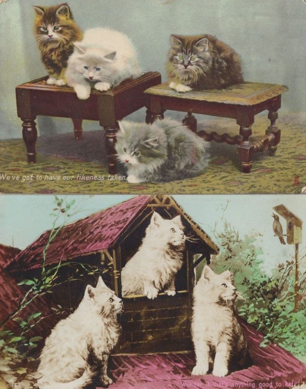 zx121 Two antique real photo talking kitten postcards -one is a bird in a bird house singing to the cats and the kittens are discussing if there is food over there - the other is the four kittens discussing posing for a picture together preparing for the camera - both very good condition.