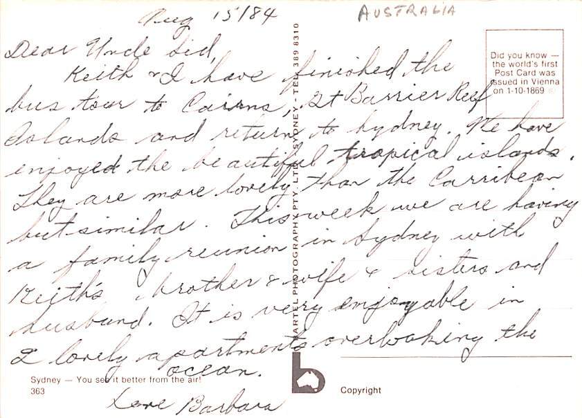 Birds Eye View Sydney Australia Writing on back