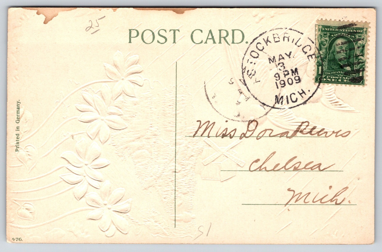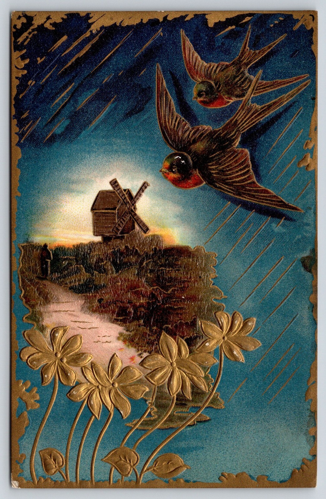Birds Fly Over Windmill Scene~Man~Gold Flowers~Emboss~c1910 Vintage Postcard