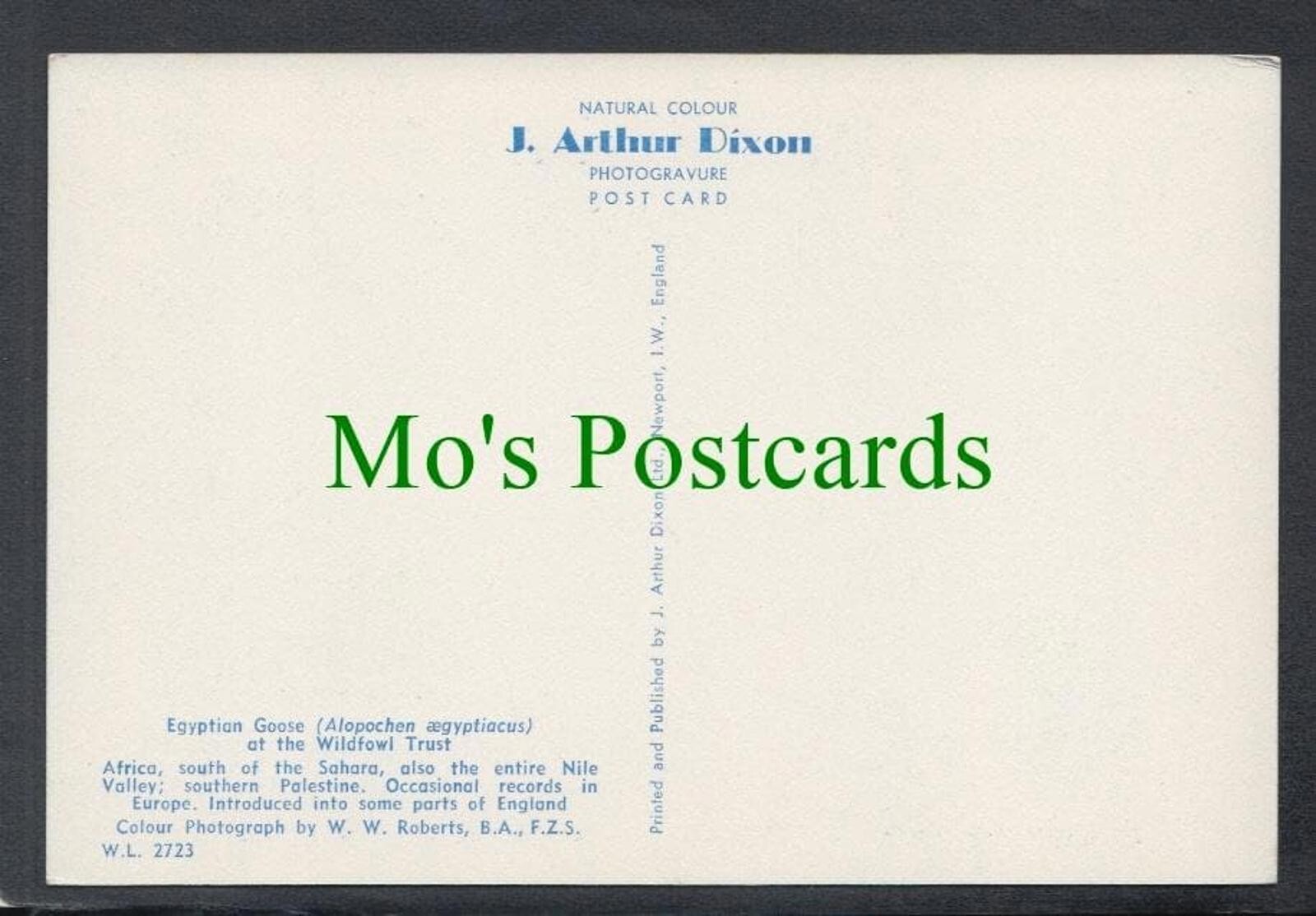Postcard showing a Birds Postcard - Egyptian Goose.Mo's Postcards offers for sale a Birds Postcard - Egyptian Goose at The Wildfowl Trust.Non standard size postcard. Published by J.Arthur Dixon. Slight wear to the top left hand corner.Any significant defects will be noted within this descriptive text.Please study the scanned images carefully to form your own opinion of the condition. All of Mo's Postcards are protected inside a plastic sleeve and are shipped inside a board backed envelope which is marked please do not bend. Mo's Ref No: SW3907