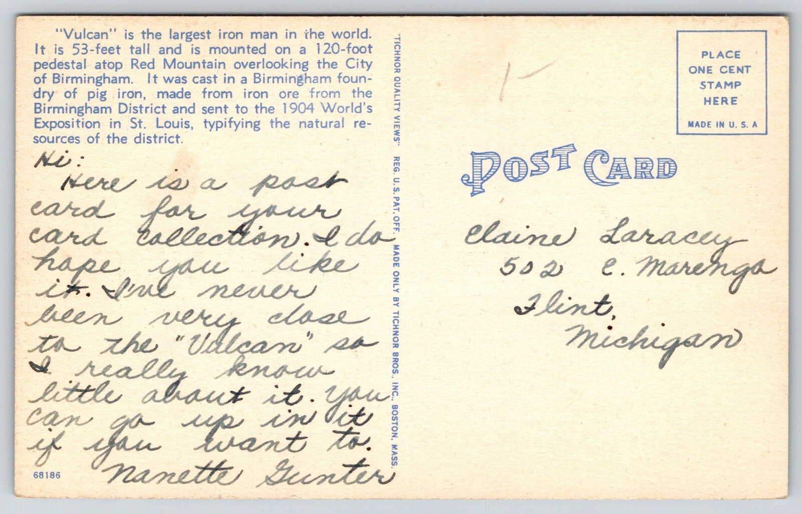Birmingham Alabama~Red Mt~Vulcan Iron Man Statue~Tower~Linen 1950s Postcard
