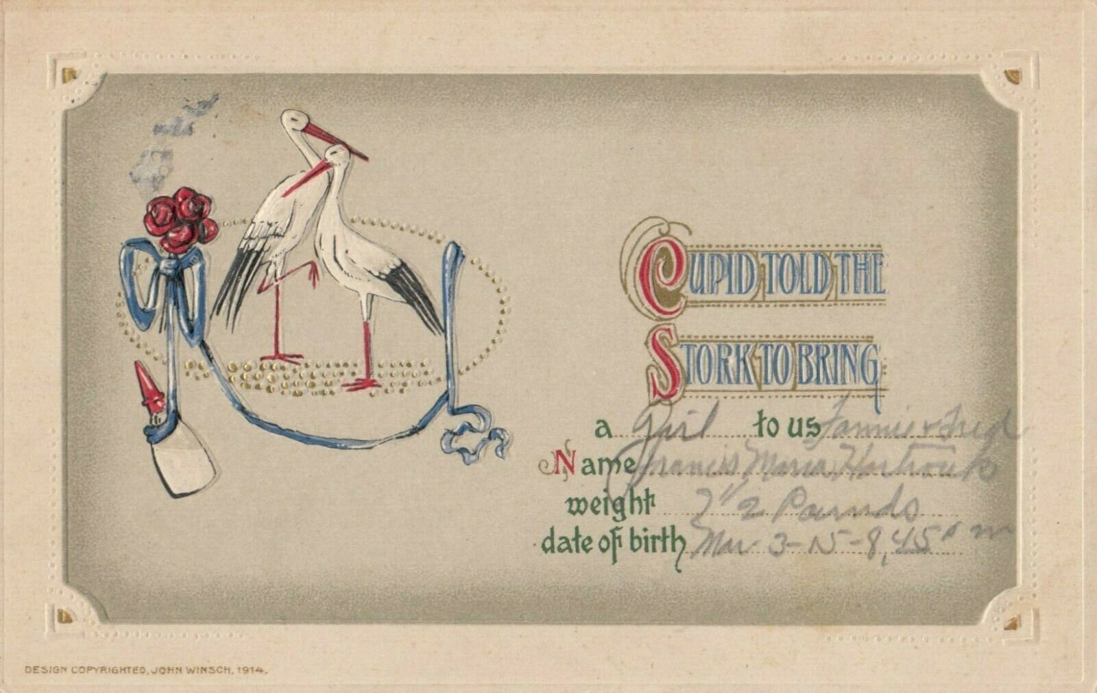Birth Announcement, 1915s , Stork ; John Winsch