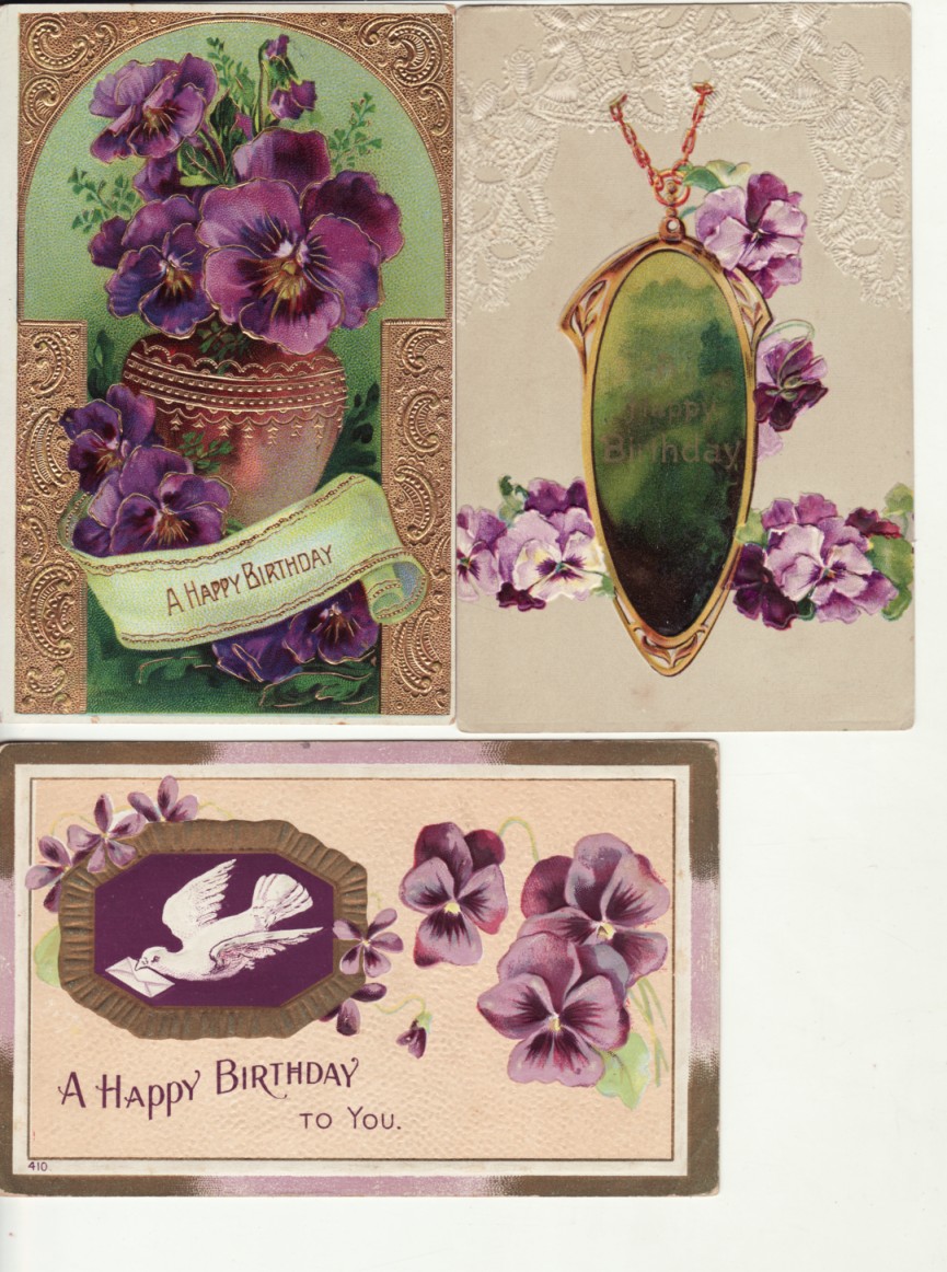 BIRTHDAY PURPLE FLOWERS / PANSY / VIOLET 3 postcards