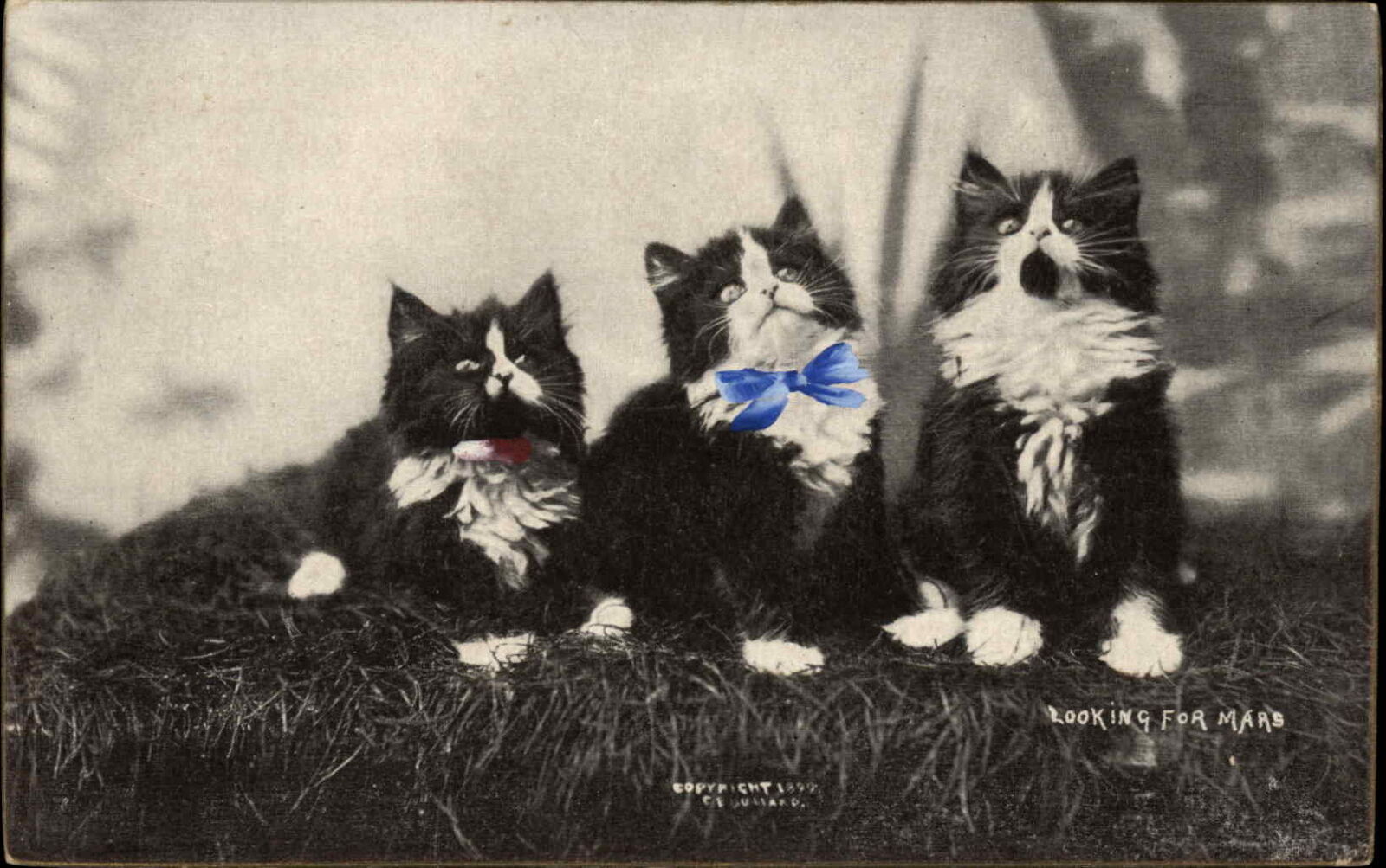 Black and White Kittens Stare at Sky "Looking at Mars" c1910 Postcard