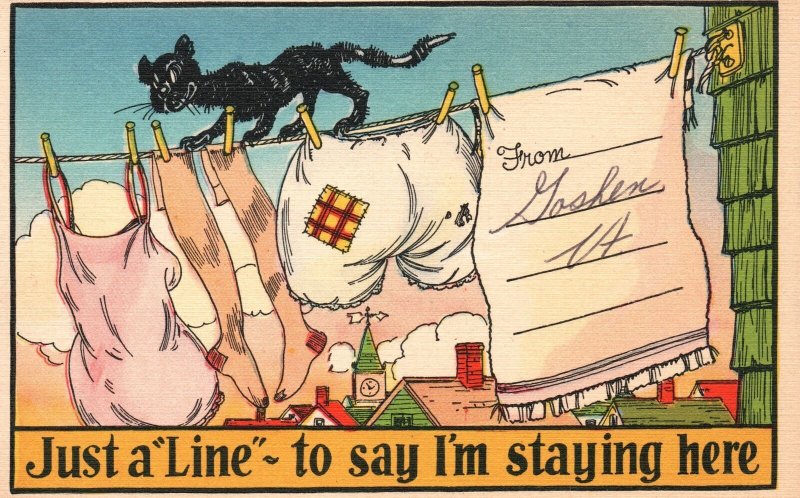 Black Cat Walking on Clothes Line, Just a Line I'm Staying Here, Comic, Postcard