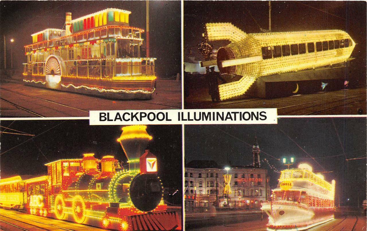 BLACKPOOL ENGLAND UNITED KINGDOM TRAIN SHIP MULTI-VIEW CHROME POSTCARD c. 1960s