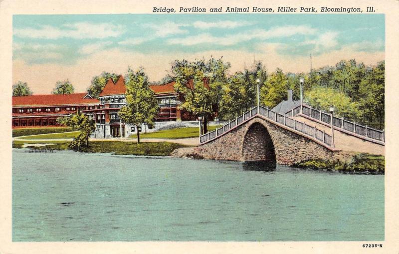 BLOOMINGTON, IL Illinois BRIDGE PAVILION & ANIMAL HOUSE c1930's Postcard