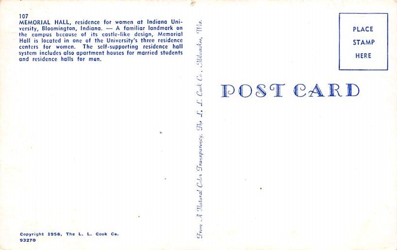 Bloomington, Indiana IN Postcard Grade: 1 Size: Regular Size Postcard - approximately 3 1/2 inch x 5 1/2 inch (9 CM x 14 CM) Grading Scale: Grade 1 = Perfect corners Grade 2 = Very Minimal corner wear, no creas ... Read More