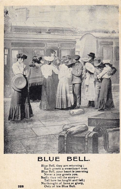ts142 Antique postcard of Bluebell which is a train returning with bluebells and the passengers there in anticipation - has top left corner fault otherwise great unused condition so vg