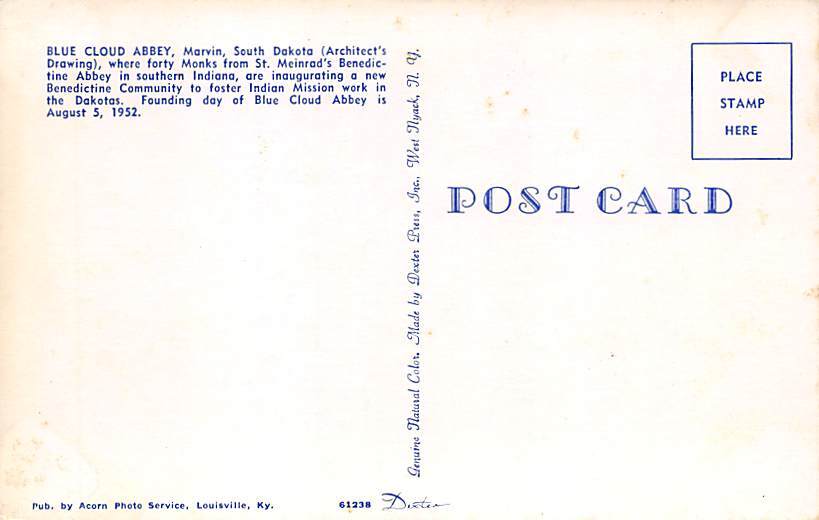 Blue Cloud Abbey Marvin, South Dakota Postcard - Unused Grade: 2 Size: R - Regular Size Postcard - approximately 3 1/2 inch x 5 1/2 inch (9 CM x 14 CM) Grading Scale: Grade 1 = Perfect corners Grade 2 = Very Mi ... Read More