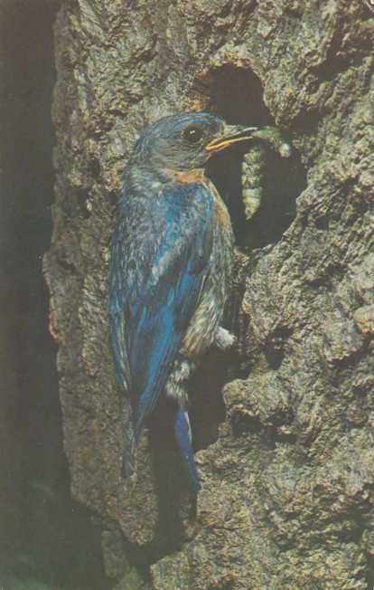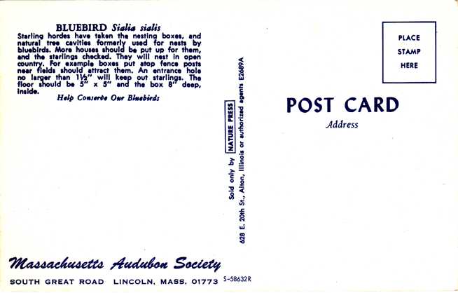 Bluebird dining on a large caterpillar. Standard sized chrome card. Published by the Massachusetts Audubon Society. Excellent condition.