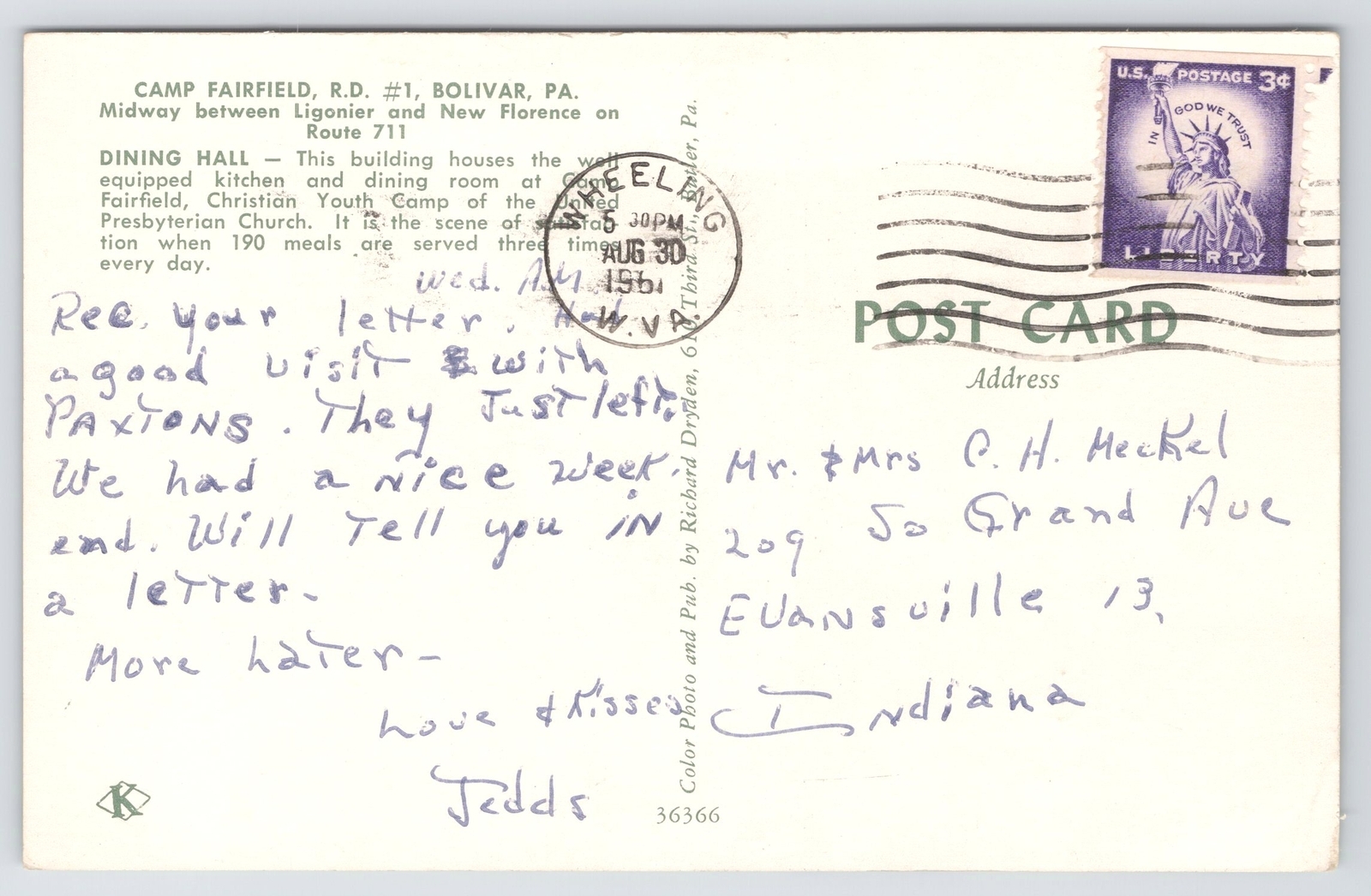 Bolivar Pennsylvania~Camp Fairfield~Dining Hall~1967 Postcard